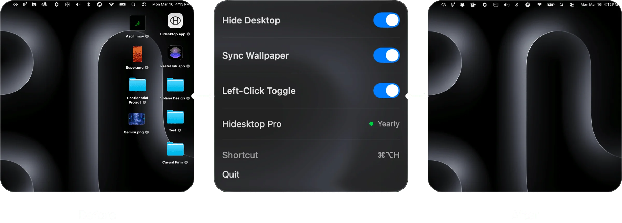 Hide desktop clutter in one click before meetings, screen sharing, or recording on your Mac.
